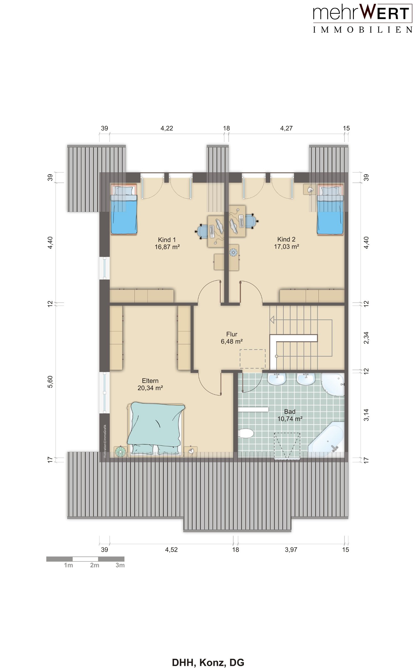 Im DG, ca. 71 m², sind 2 große Kinderzimmer und das Elternschlafzimmer untergebracht. Das große Bad besitzt eine Eckbadewanne und eine Dusche.