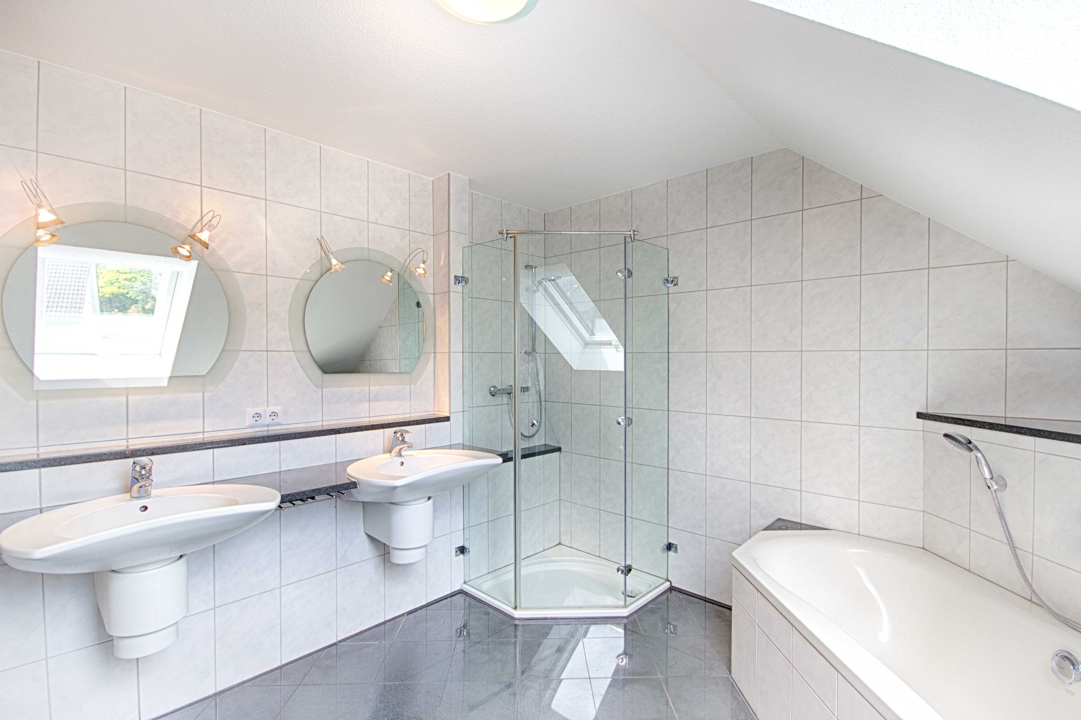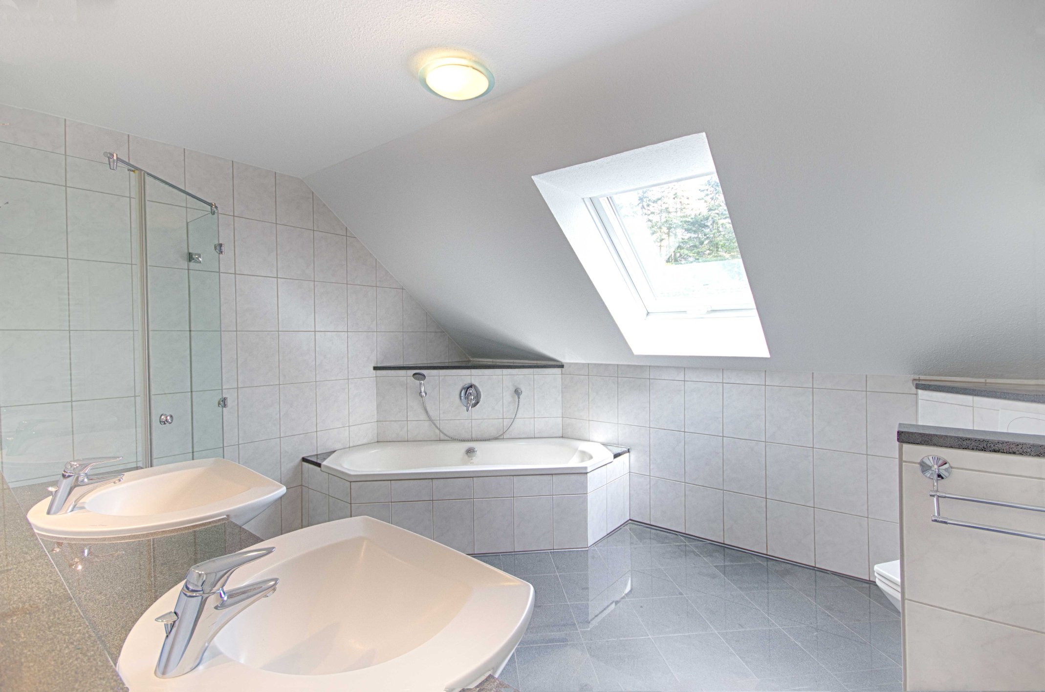 Im DG, ca. 71 m², sind 2 große Kinderzimmer und das Elternschlafzimmer untergebracht. Das große Bad besitzt eine Eckbadewanne und eine Dusche.
