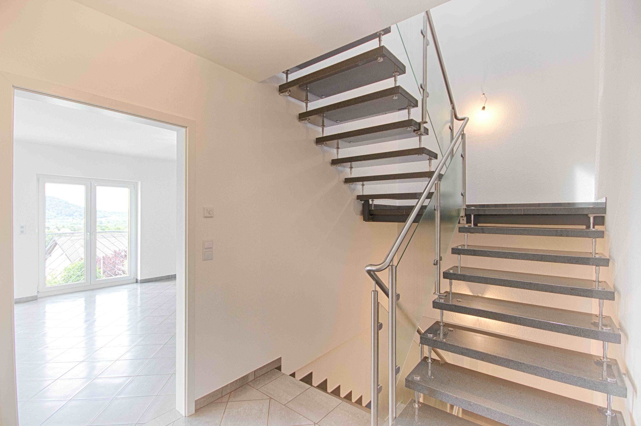 Die Etagen werden über eine Granittreppe mit Edelstahl/Glas-Geländer erschlossen.