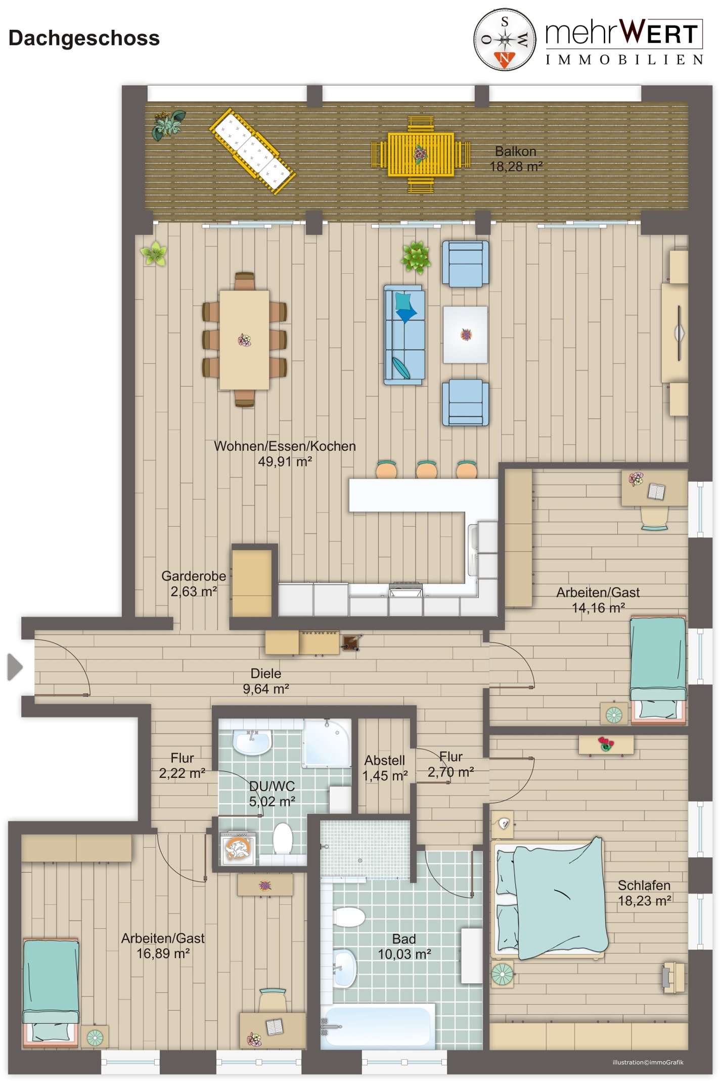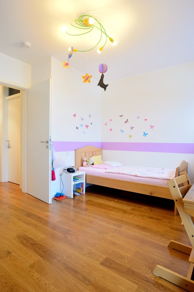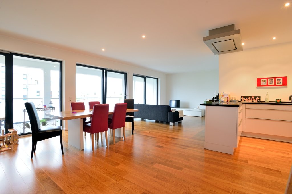 Die Wohnfläche von ca. 140m² verteilt sich auf einen großzügigen und hellen Wohn-/ Essbereich mit offener Küche (Markenküche im Kaufpreis bereits enthalten) und großer Fensterfront. Über Schiebetüren erreichen Sie den sonnigen und geräumigen Südbalkon.