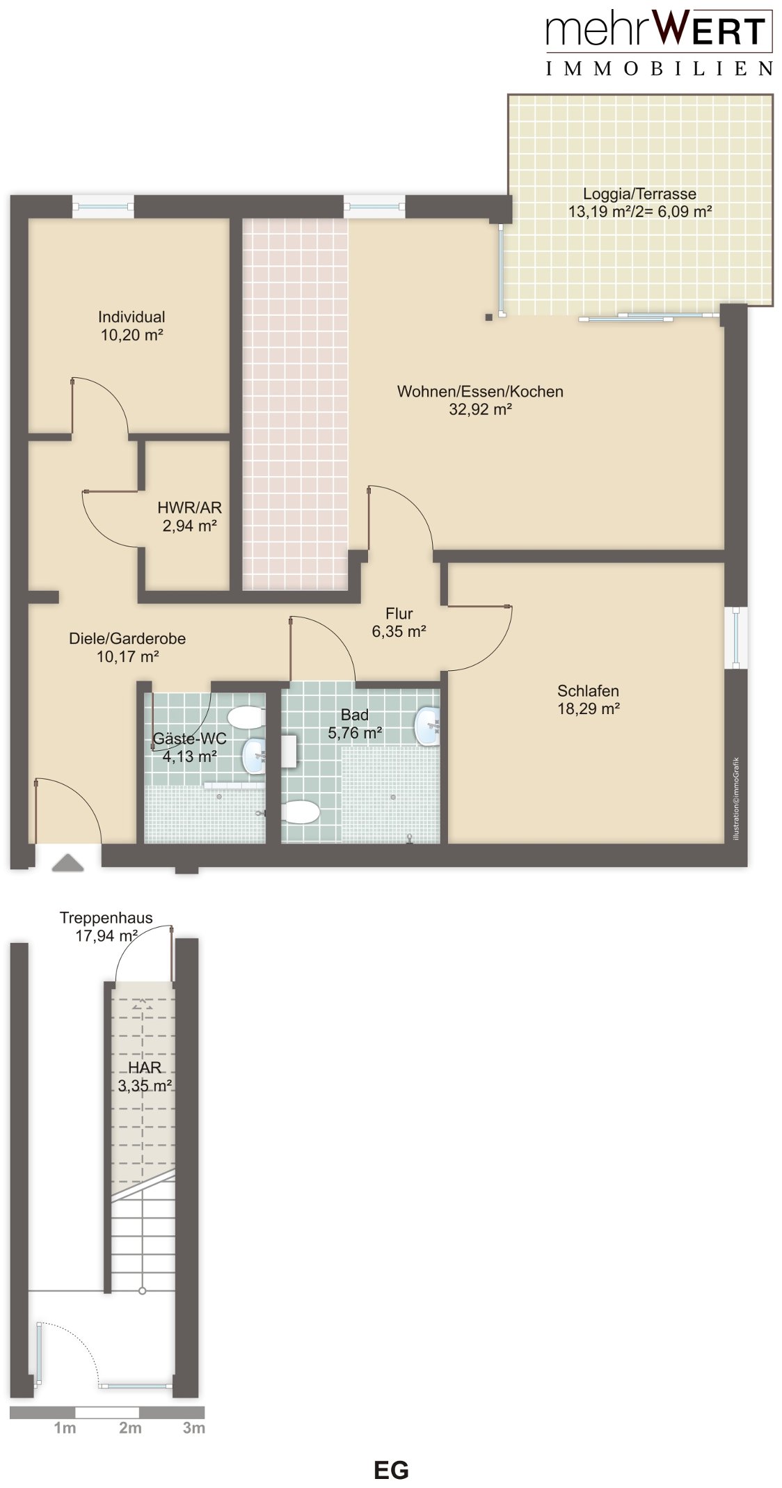 Alle Räume sind mit Fliesen und Fußbodenheizung ausgestattet. Für Ihre Waschmaschine und Trockner steht ein eigener Hauswirtschaftsraum zur Verfügung.