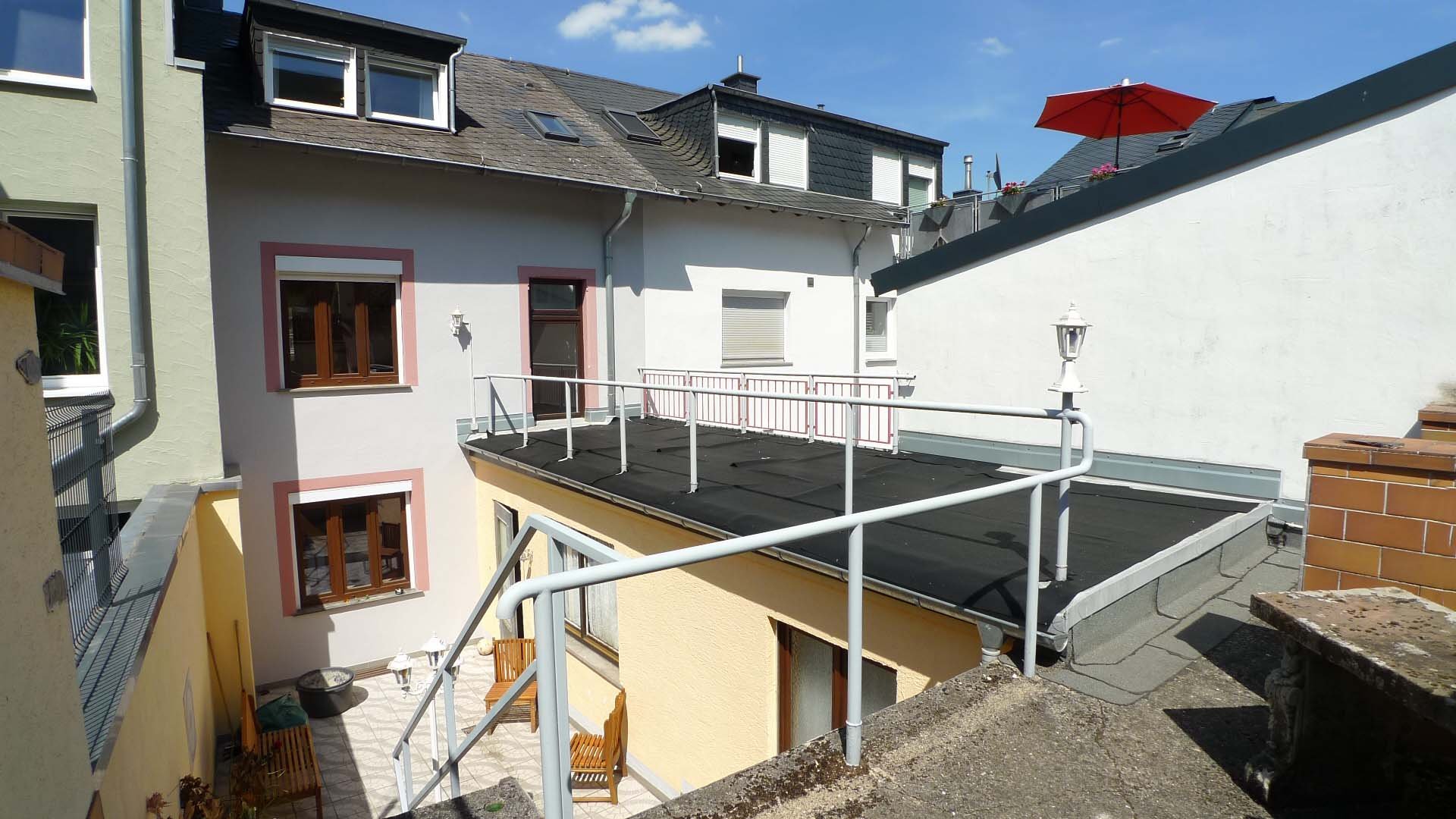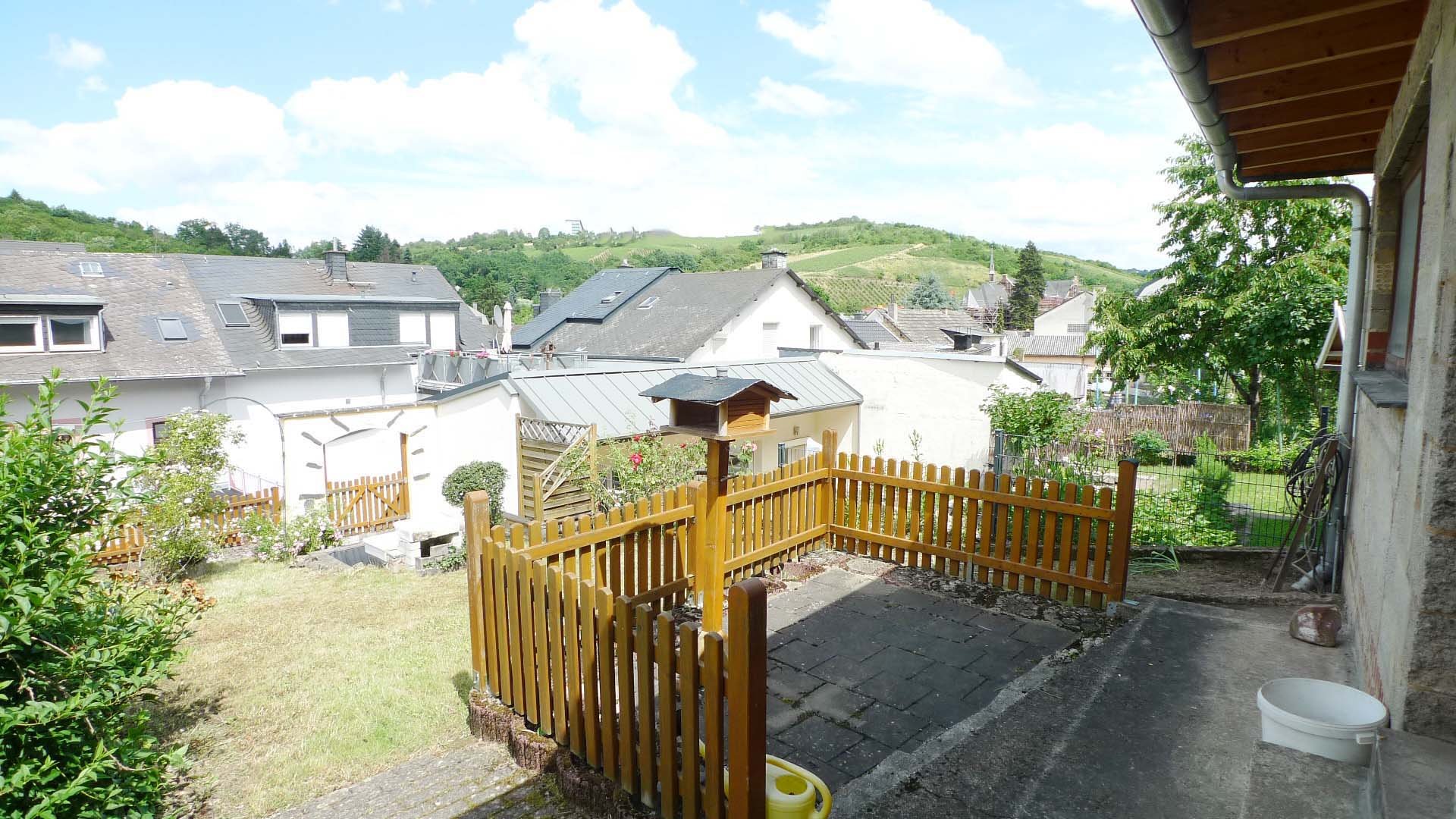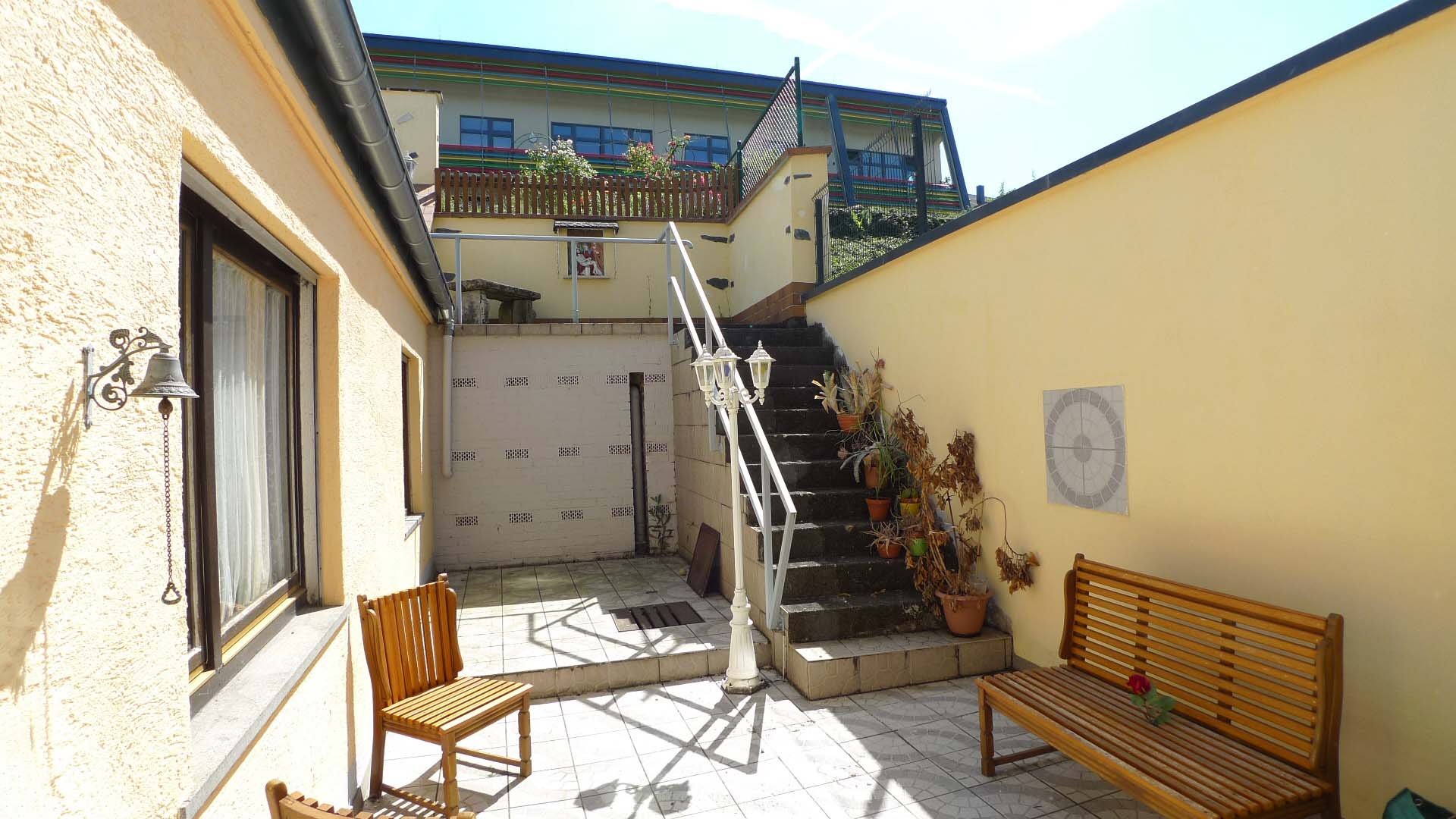 Die Terrassenhof ist komplett gefliest. Zum Garten gelangen Sie über eine Treppe (Hanglage). Im Oberen Teil des Garten steht eine gemauertes Gartenhaus mit einer kleinen Terrasse.