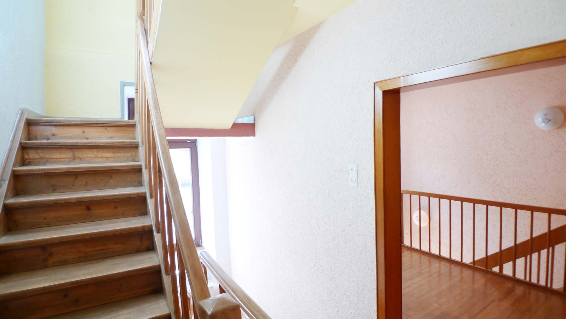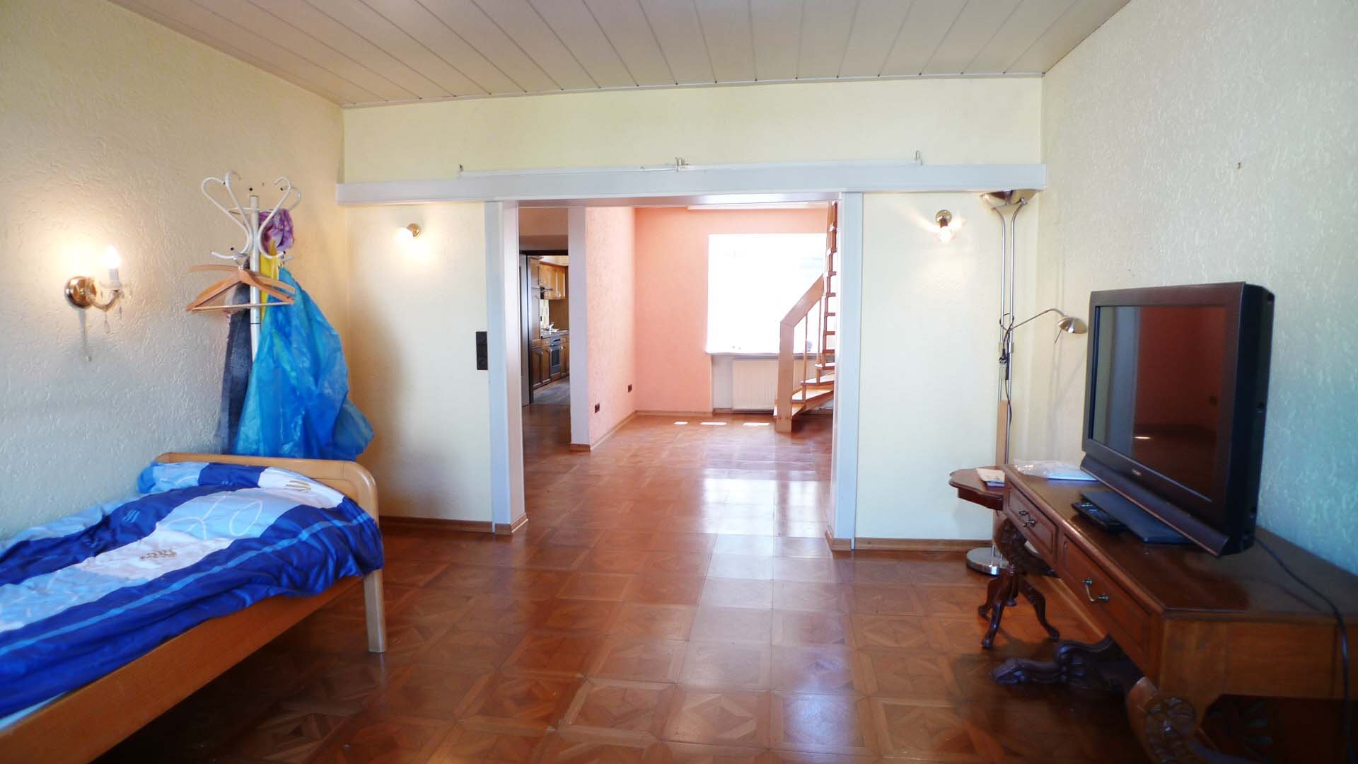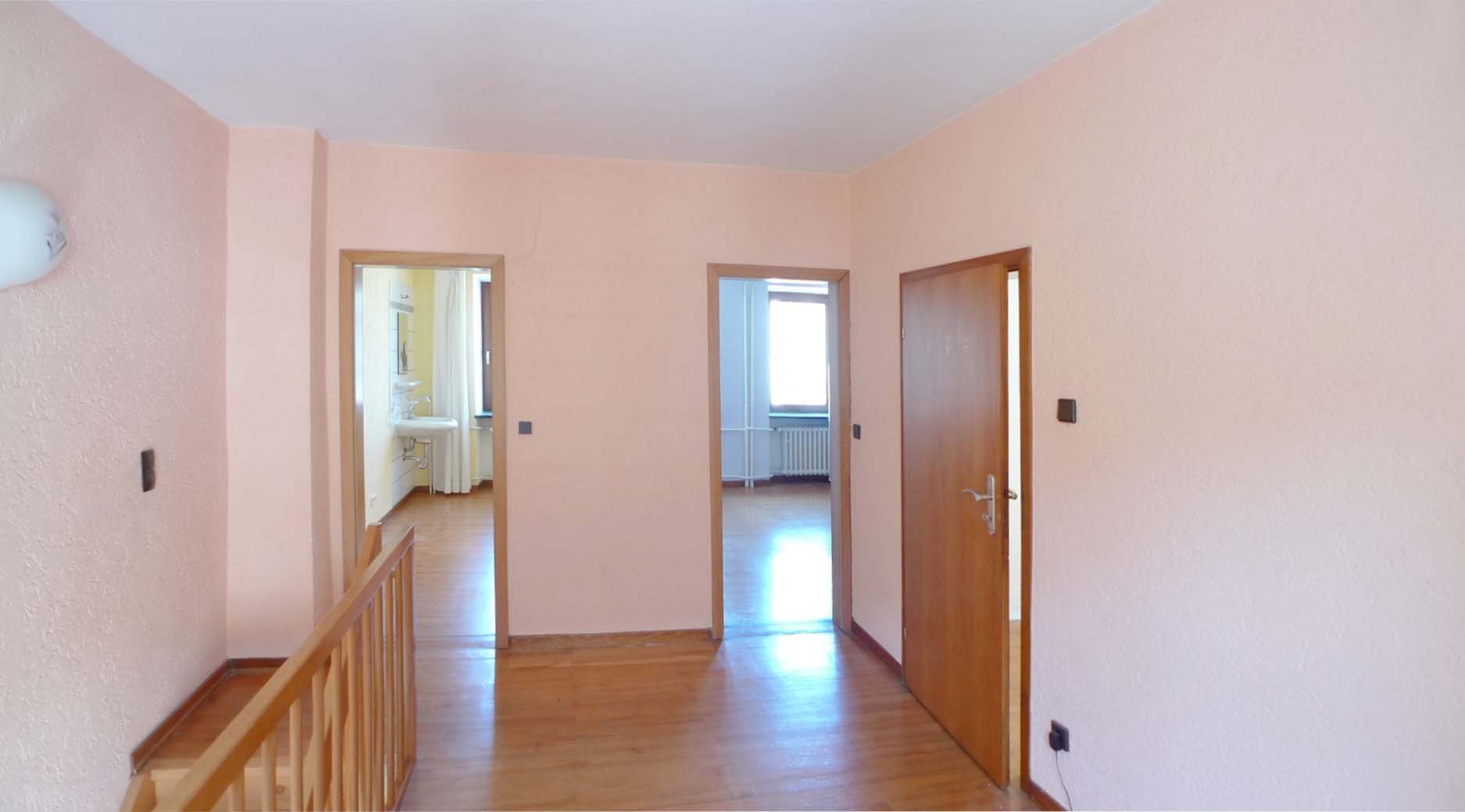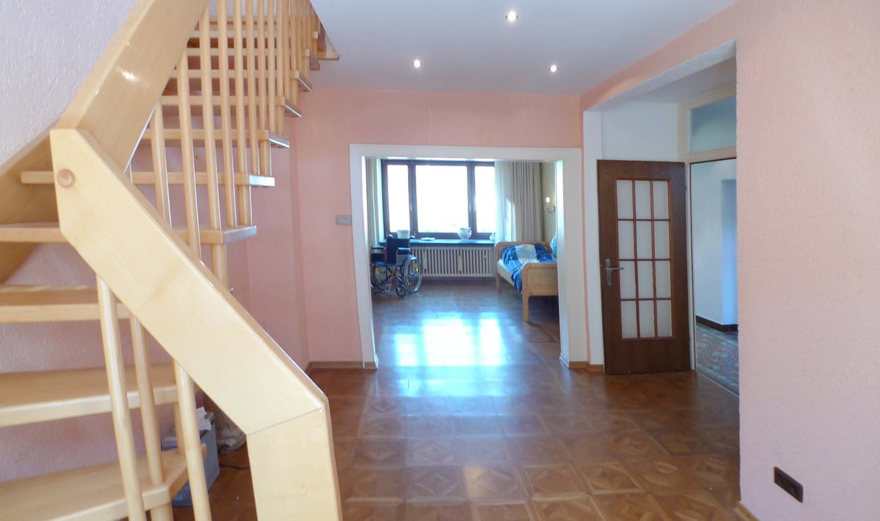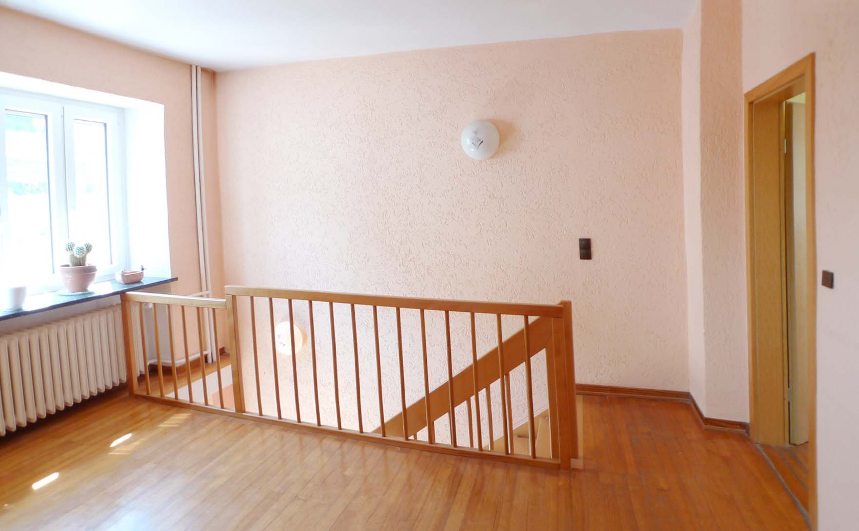 Die drei Ebenen werden durch ein Treppenhaus erschlossen. Sinniger Weise wurde im Jahre 1992 im Esszimmer ein Deckendurchbruch durchgeführt und mit einer Holztreppe versehen, so das man auch aus dem Wohn- Essbereich direkt ins Obergeschoss zur Galerie und zwei Schlafzimmern gelangt. Wie schon erwähnt, ist das Obergeschoss selbstverständlich auch durch das Treppenhaus zu betreten.