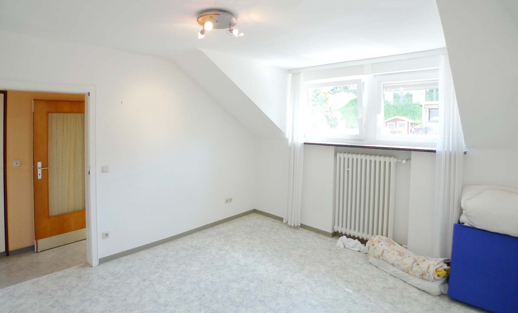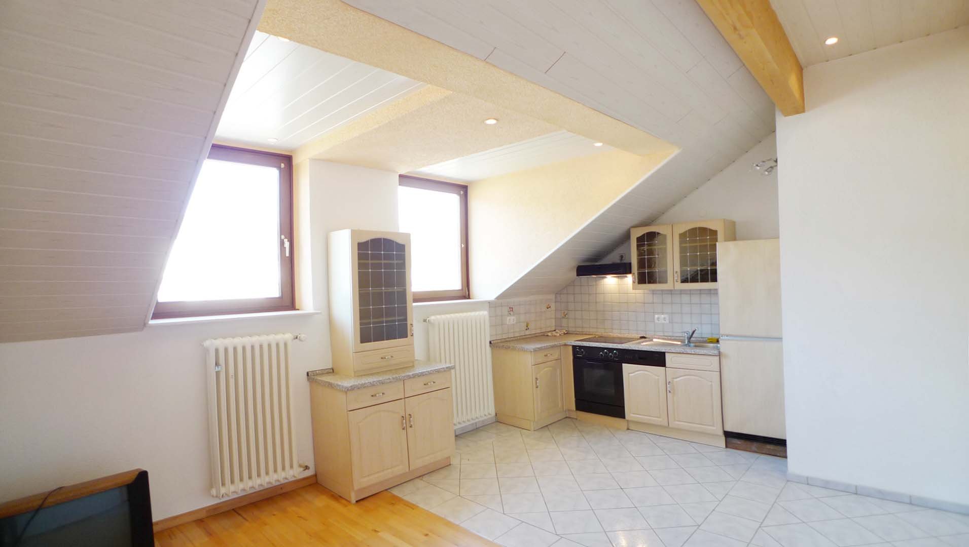 Im Dachgeschoss liegen noch ein Schlafzimmer, ein großer Wohn-Küchenbereich mit Einbauküche und einem kleinen Badezimmer mit Toilette, Waschbecken und Dusche.